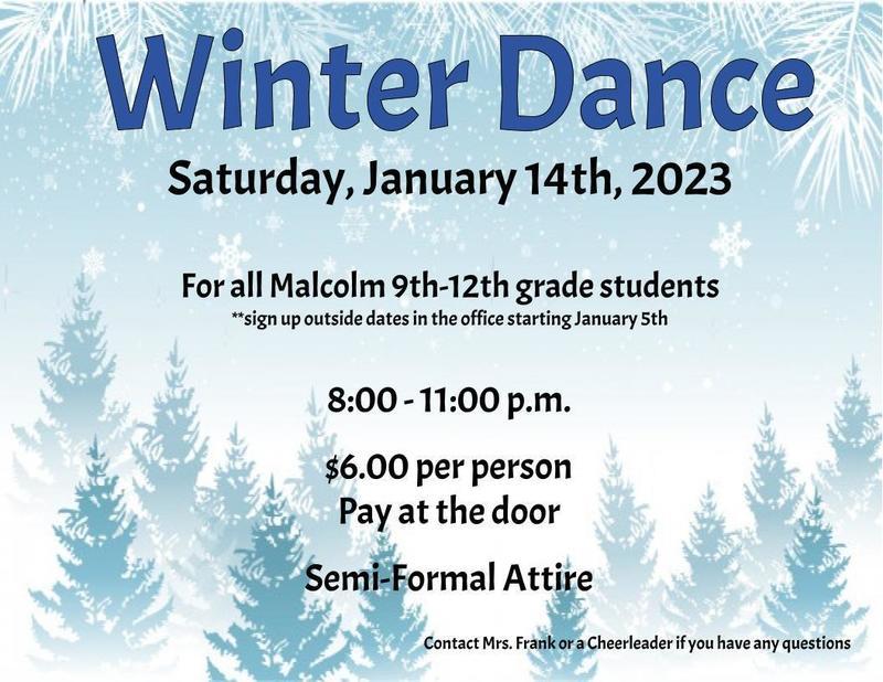 The MHS cheerleaders will host a Winter Dance on January 14th from 8-11:00PM. The dance is open to 9th-12th graders only. See Mrs. Frank with questions